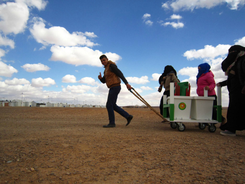 Even more surprising was their next stop at the football pitch. Women don’t play football around here but their confidence now brought them and the Pop-In onto the pitch where they ‘opened’ (their term… a nice reflection of unfolding the mat and opening for business). They played some traditional Syrian music this time and sat on the stools themselves while with great delight the football team danced for them. I could feel the balance of power shifting in the whole camp.